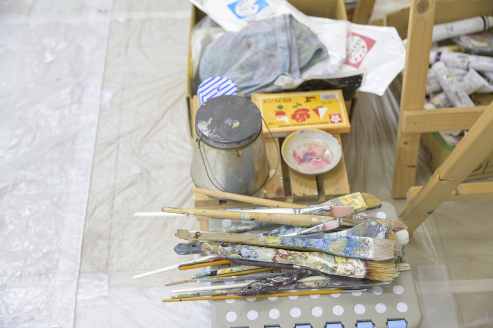 絵の具や画材もそのまんま置いてあるので、興味深そうに見る方たくさん。
